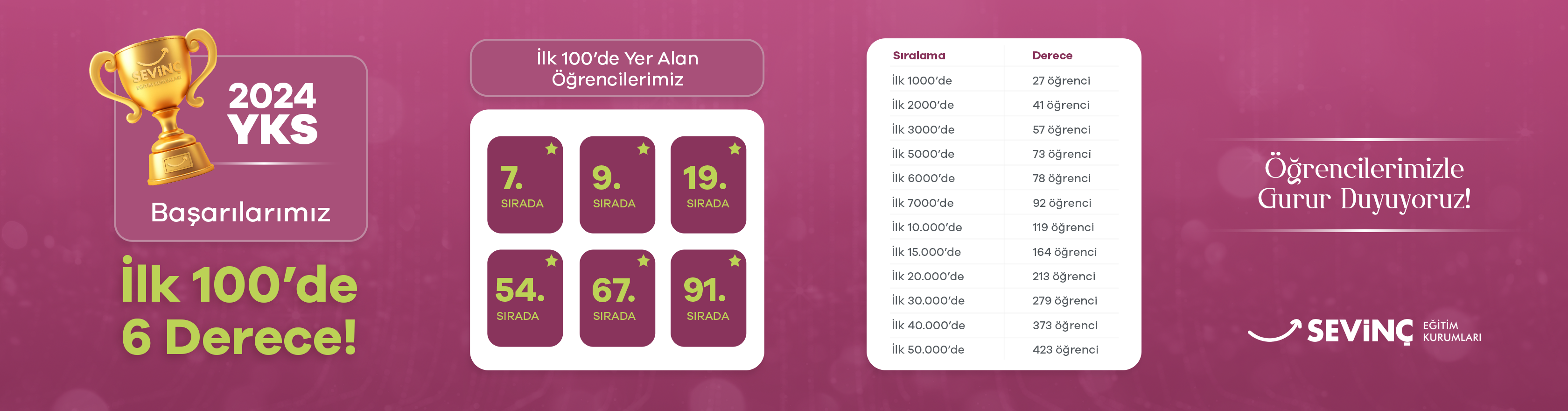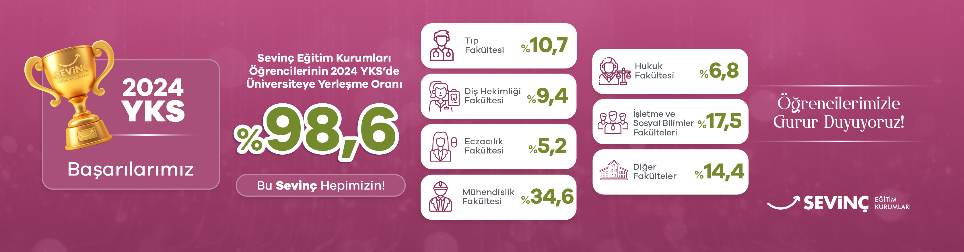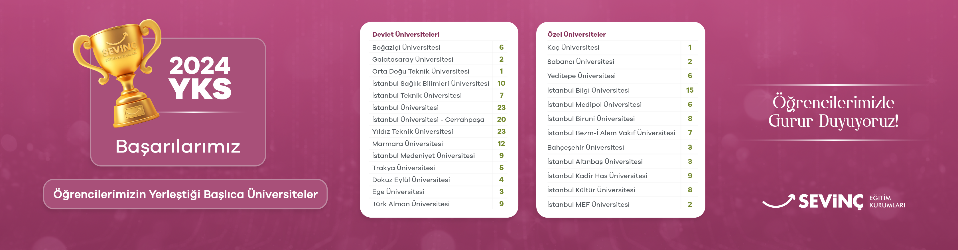 Bugün Türkiye’nin en yüksek puanla öğrenci alan Anadolu liseleri ve özel yabancı okullarında eğitim gören her 5 öğrenciden 1’i Sevinçlidir. Lise ve üniversite sınavlarına en iyi şekilde hazırlanan öğrencilerimiz, her yıl Türkiye’nin en başarılı okullarına ve bölümlerine yerleşerek bizlere gurur yaşatmaktadır.